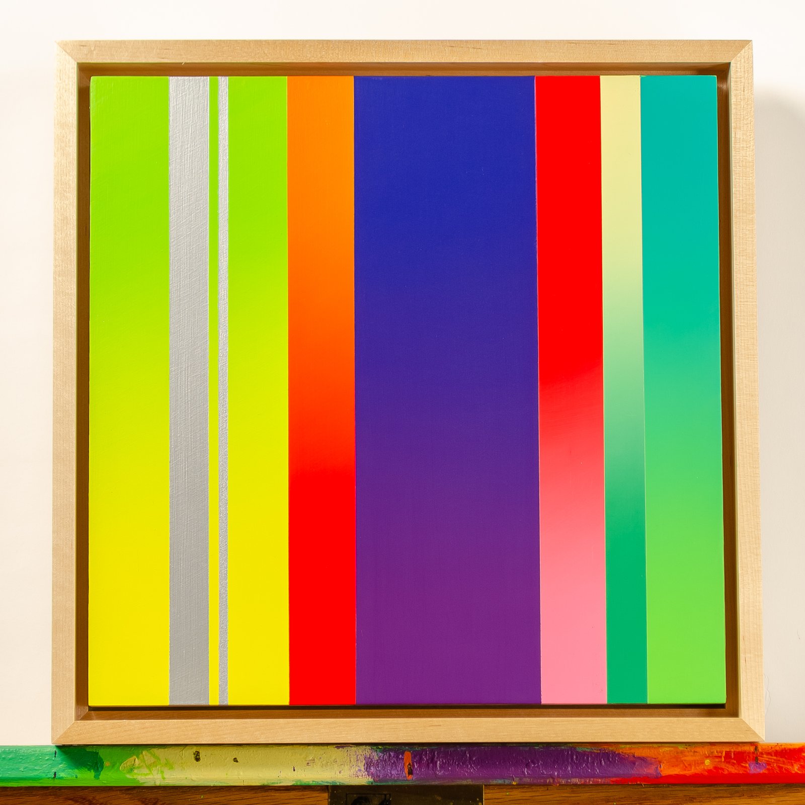 - Flat, hard-edge abstraction. Satin varnish finish. Mounted in a maple floater frame.